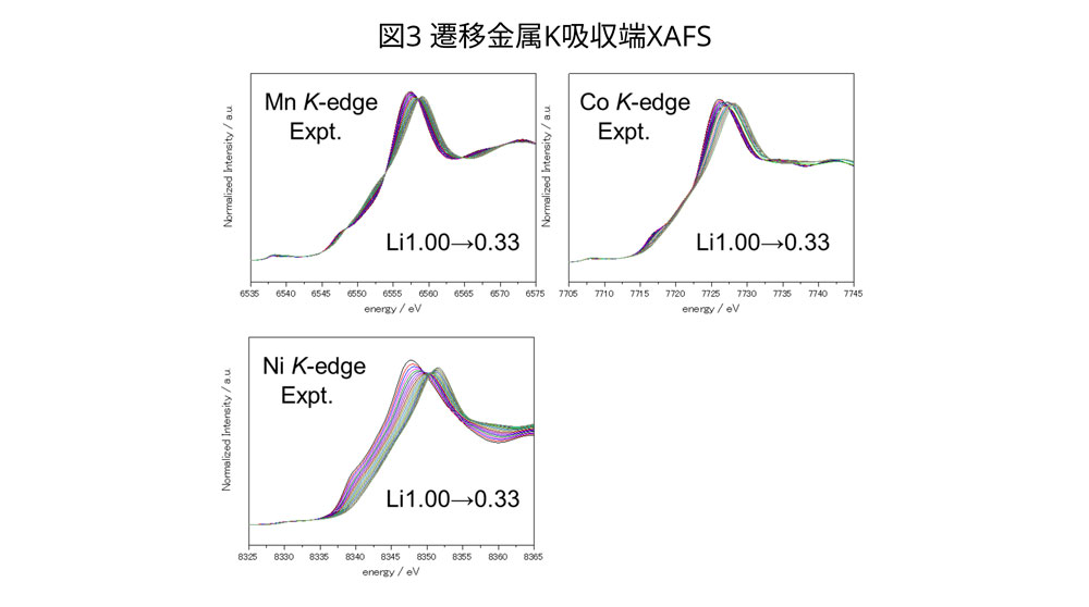 NMC正極の結晶構造を図2に示します。この特徴は、矢印示す位置の元素がランダムに存在することです。in-situ XRD法では、このランダムに位置する元素の取り扱いが困難であるため、各元素に注目したin-situ XAFS法が適しております。図3に各元素のK端XAFS測定結果を示します。Mn-KおよびCo-K吸収端では、電位変化に伴いピークトップ付近のシフトのみが観測されます。一方、Ni K吸収端では、ピーク全体が高エネルギー側へとシフトしています。この結果は、各元素の電位に対する役割が異なることを示唆するものです。日産アークでは、XAFSスペクトル解析に第一原理計算を用いています。