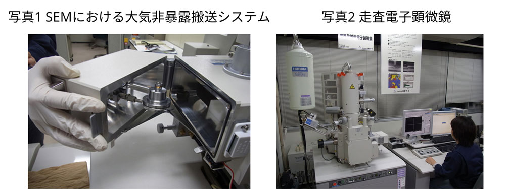 SEMによる表面観察においては、グローブボックス内で解体した試料を、専用ホルダーを用いることによって、大気に曝すこと事なく、形態を観察する事ができます(写真1,2)。反応性の高い付着物等がついている場合、大気に曝すことで形態が変化してしまう懸念があるため、大気非暴露観察は必須となります。