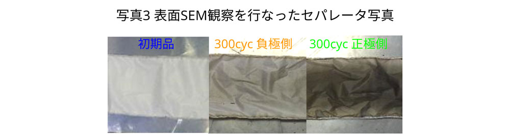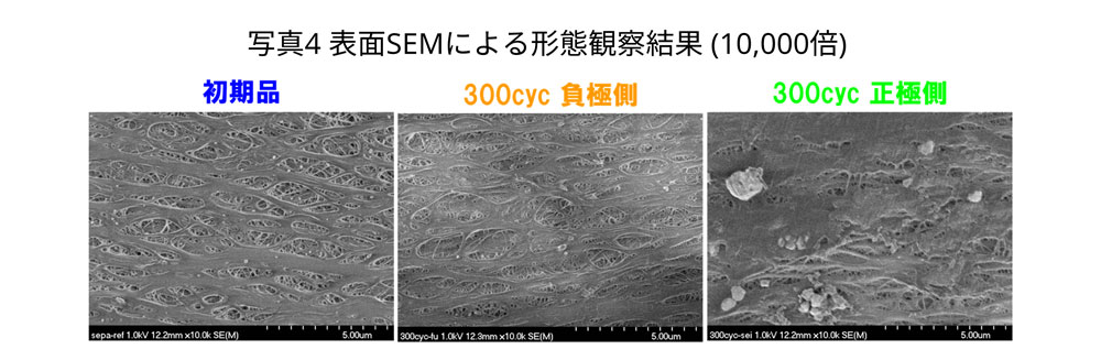 写真3に表面SEM観察を行なった初期品・300cyc品負極側・300cyc品正極側のセパレータの写真を示します。また、それらのSEMによる形態観察結果(10,000倍)を、写真4に示します。