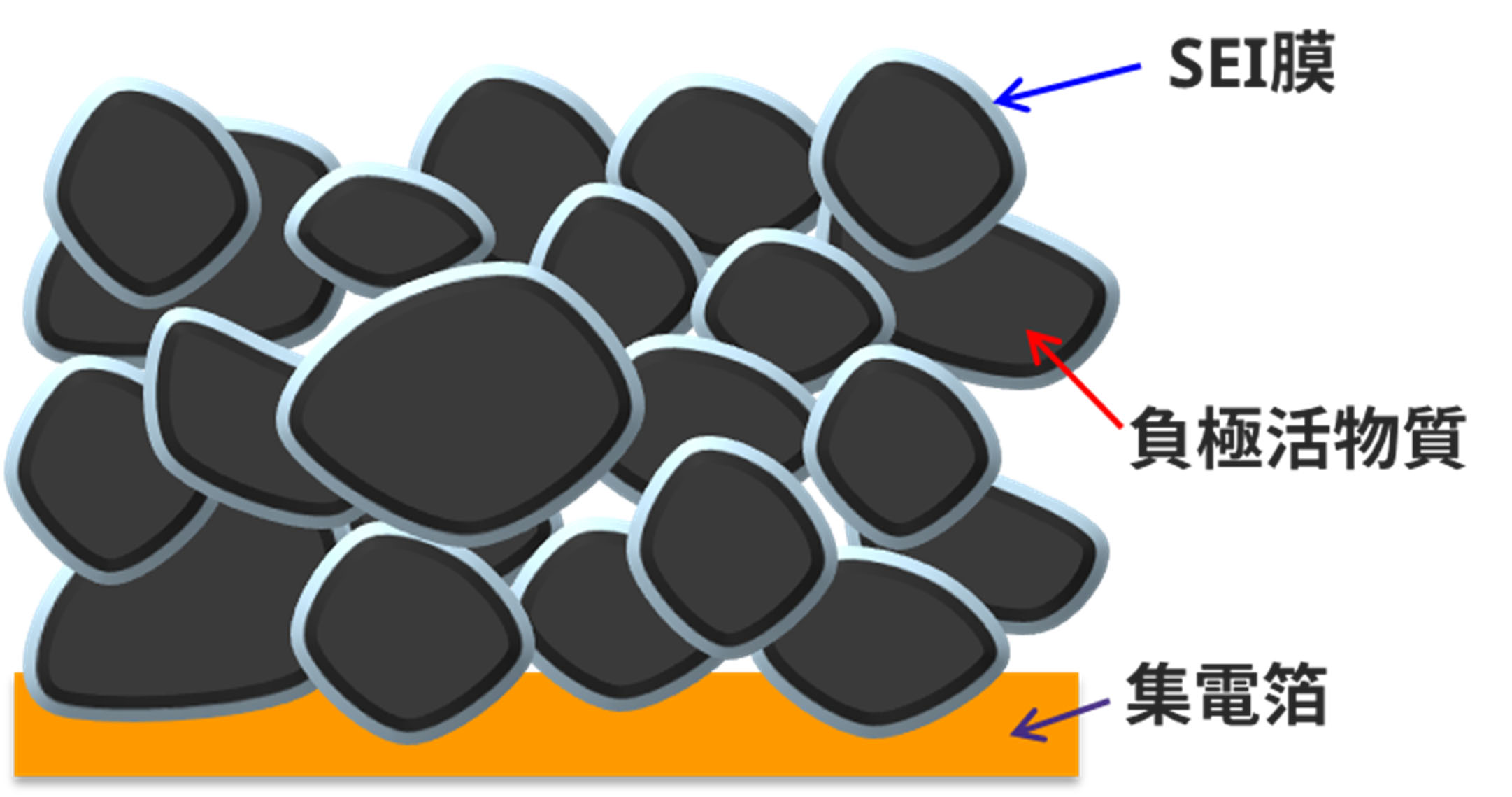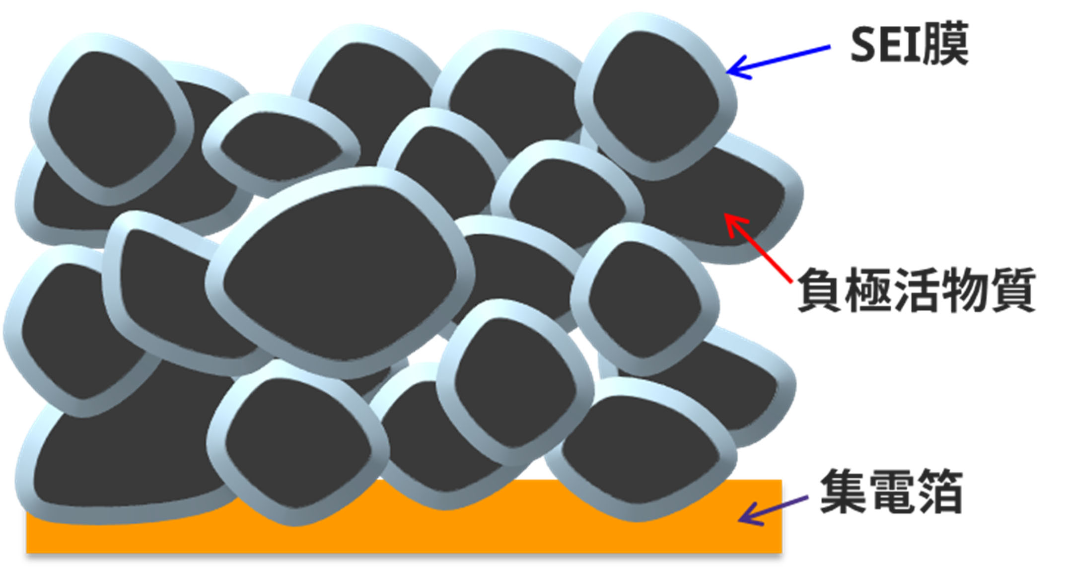 SEI膜は、主に初充放電時に電解液成分や添加剤の分解によって活物質表面に形成され、電解液の分解を抑制するとともに、スムースなリチウムイオンの挿入脱離を可能にします。