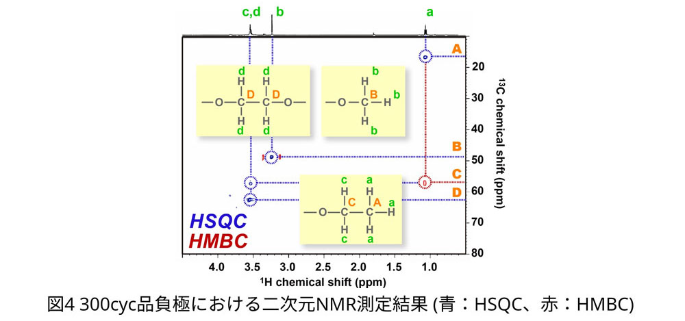 また、300cyc品負極におけるSEI抽出液の二次元NMR測定 (HSQC:Heteronuclear single-quamtum correlation、HMBC:Heteronuclear multiple bond correlation) 結果を図4に示します。