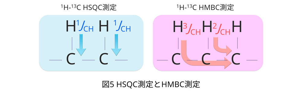 HSQC測定では直接結合している1Hと13Cの相関信号を観測でき、HMBC測定では通常2~3結合先の1Hと13Cの相関信号を観測することができます (図5)。