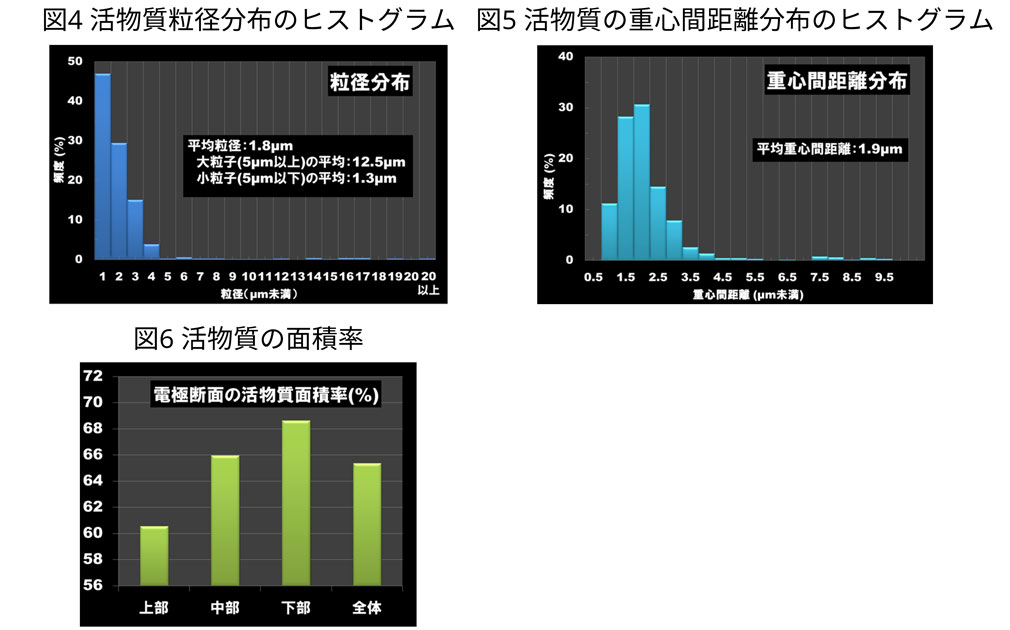図4~6は画像解析結果です。活物質粒径のヒストグラム(図4)から、5μm以上の大きい粒子は数えるほどで、5μm未満の小さい粒子がほとんどであることがわかります。粒子の重心間距離のヒストグラム(図5)には、小さい粒子間の距離を反映して2μm前後の距離が多く見られました。断面における活物質の面積率(図6)は電極全体では約65%で、上部(表面側)よりも下部(集電箔側)で数値が高くなる傾向が見られました。これは下部に行くほど活物質が密になっていることを示しています。