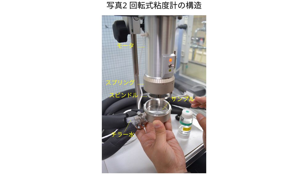 回転式粘度計は、モータの回転が検定済みのスプリングを介してスピンドルに伝達されます。測定液中、浸漬されたスピンドルには粘性摩擦トルクが働き、このトルクとスプリングの力が平衡した状態で定常回転します。電解液の粘度はこのトルク値と換算定数により求めます。