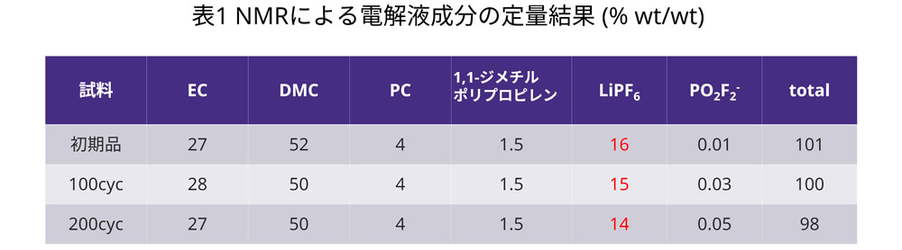 市販品電池の電解液について、粘度測定およびNMR測定を行いました。図3に示す粘度測定結果よりサイクル品はサイクルが増すごとに粘度の低下が認められました。また、表1に示すNMRによる電解液組成定量分析結果より、サイクル品はサイクルが増すごとにリチウム塩の減少と変性物の生成が認められました。上記結果から、電解液中のリチウム塩の分解によりリチウム塩濃度が減少したため、粘度が低下したものと推測されます。