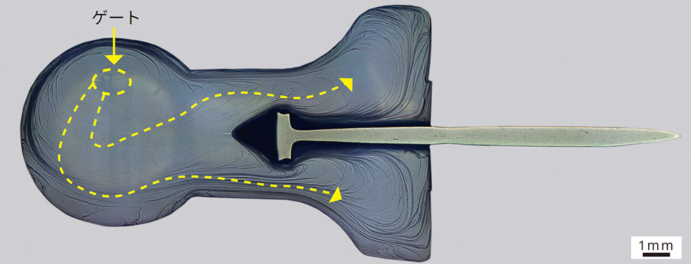 ゲートから充てんされたポリスチレン樹脂が、金属のピン側に向かって流動しているのが鮮明に表れています。