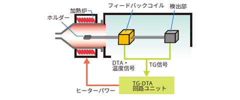 TG-DTA (熱重量-示差熱同時分析装置) の加熱炉に試料を入れ、昇温し、重量と発熱、吸熱状態の変化を測定ユニットで測ります。ガス化したものはガス分析ユニットに送られ、その成分を分析します。