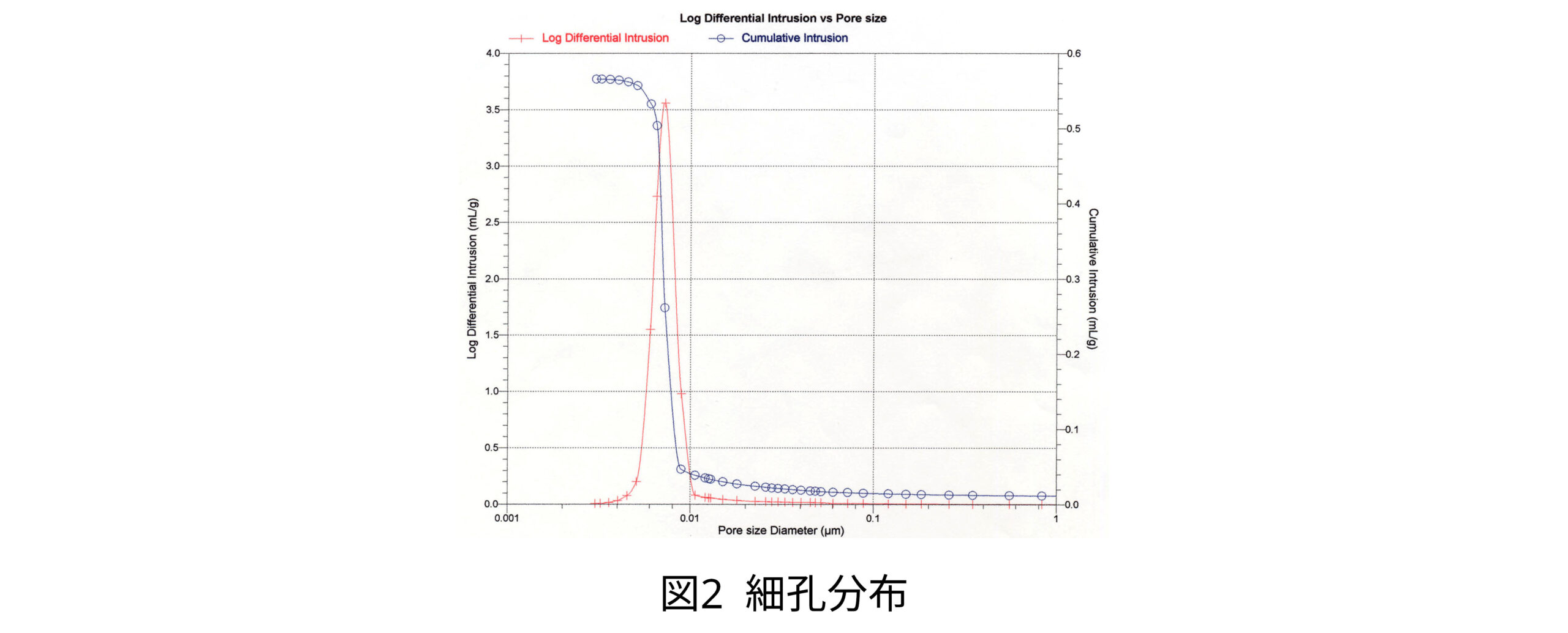 細孔分布の測定には、水銀圧入法とガス吸着法が広く使われています。一般的には比較的大きな細孔群の測定には水銀圧入法を、小さな細孔群にはガス吸着法が用います (図1参照) 。これらを測定試料の用途に応じて両者をうまく使い分けることが必要です。