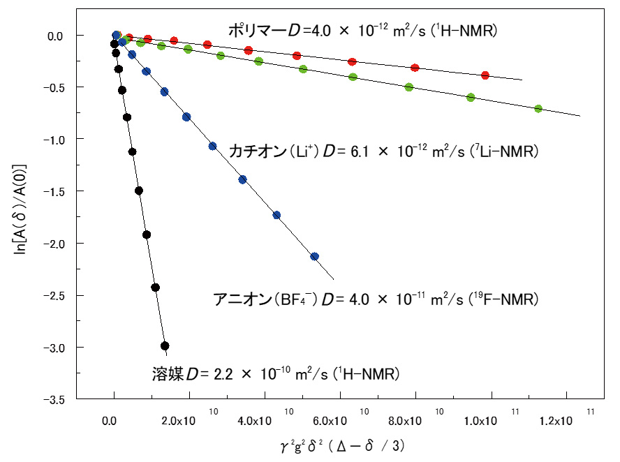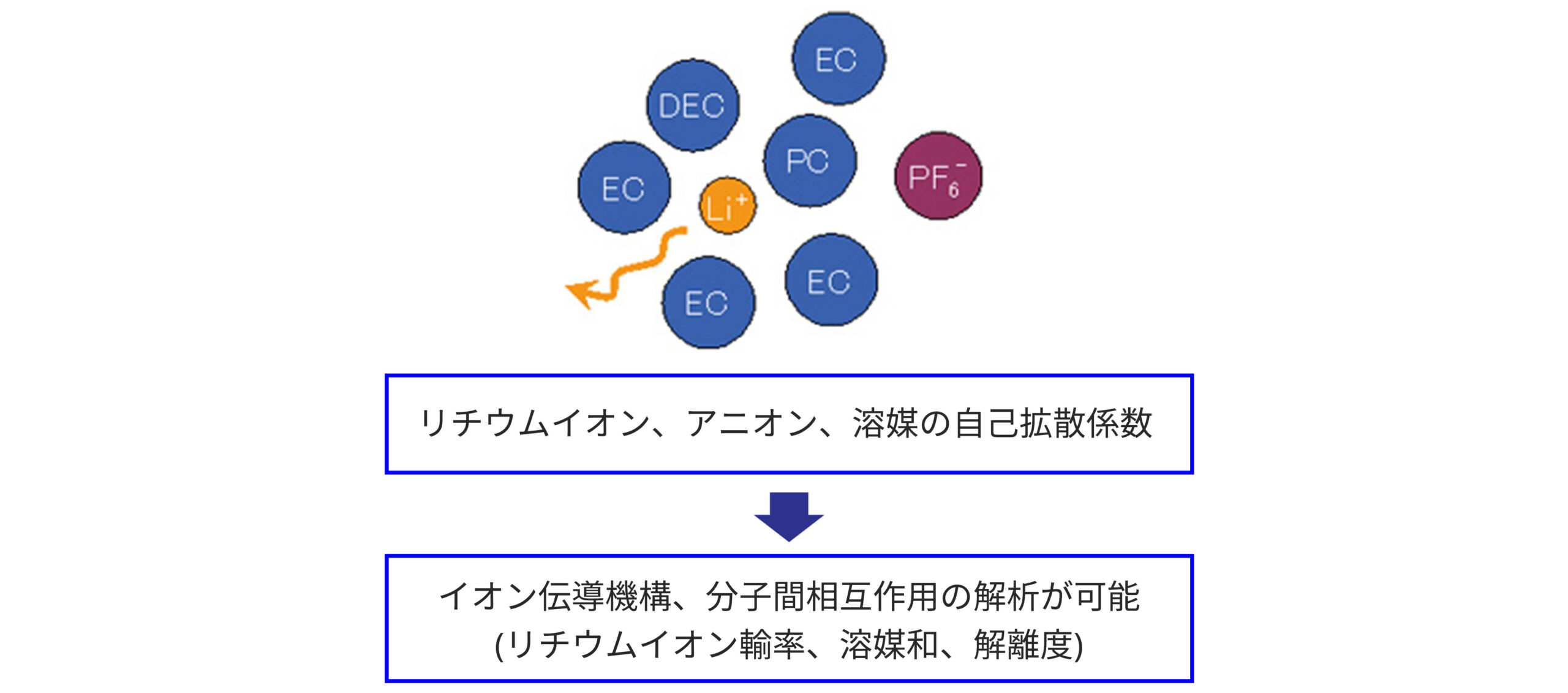 日産アークでは、リチウムイオン、アニオン、溶媒の自己拡散係数を個別に測定し、電解質の物性を評価することができます。