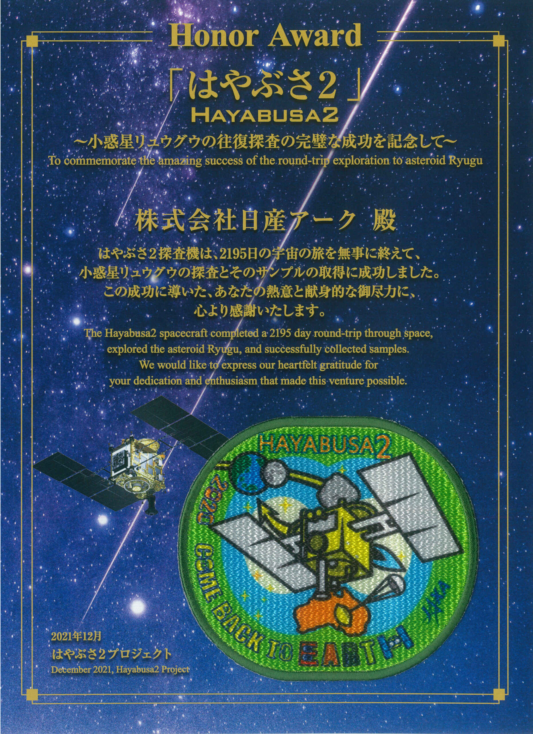 はやぶさ2が探査から無事帰還したこととに喜ぶとともに感謝状をいただき、参画したことに誇りに感じています。